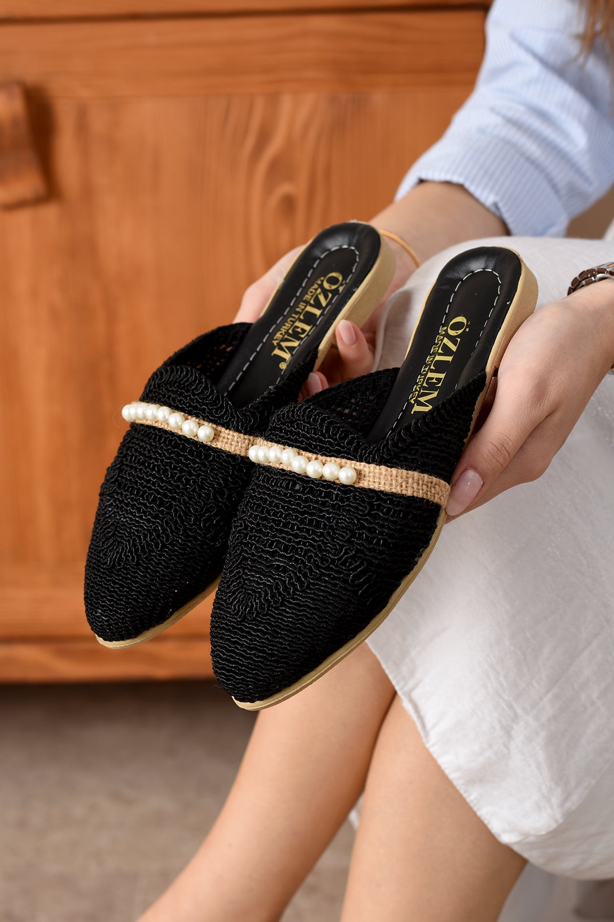 Lisa Kadın Günlük Konforlu Örme Işlemeli Inci Terlik Hasır Tatil Çeyiz